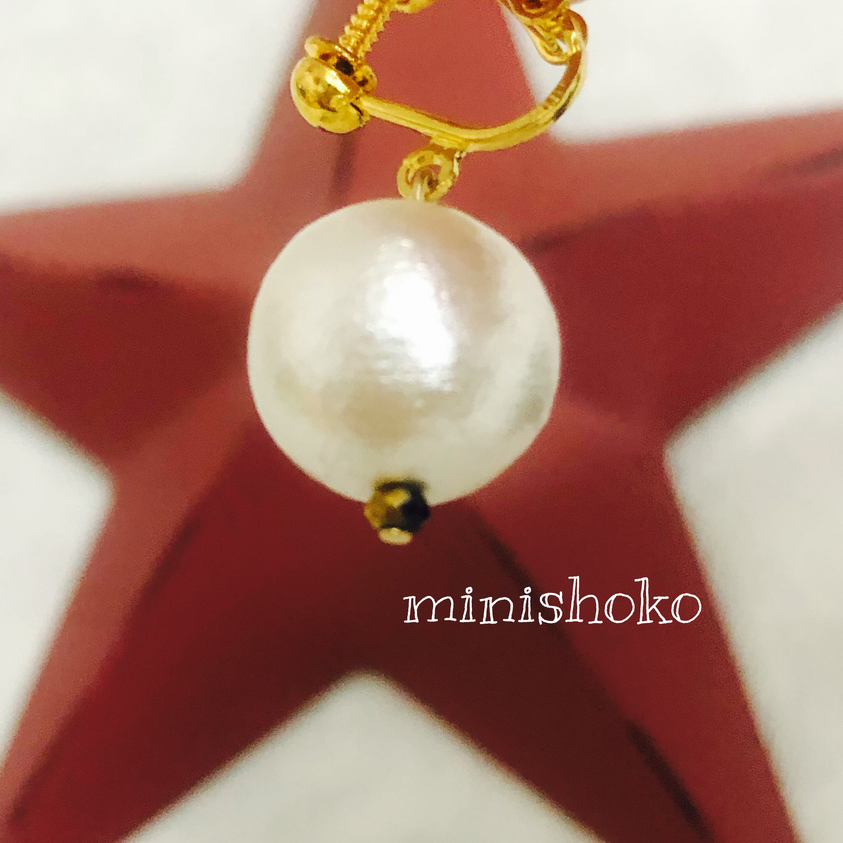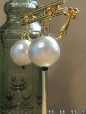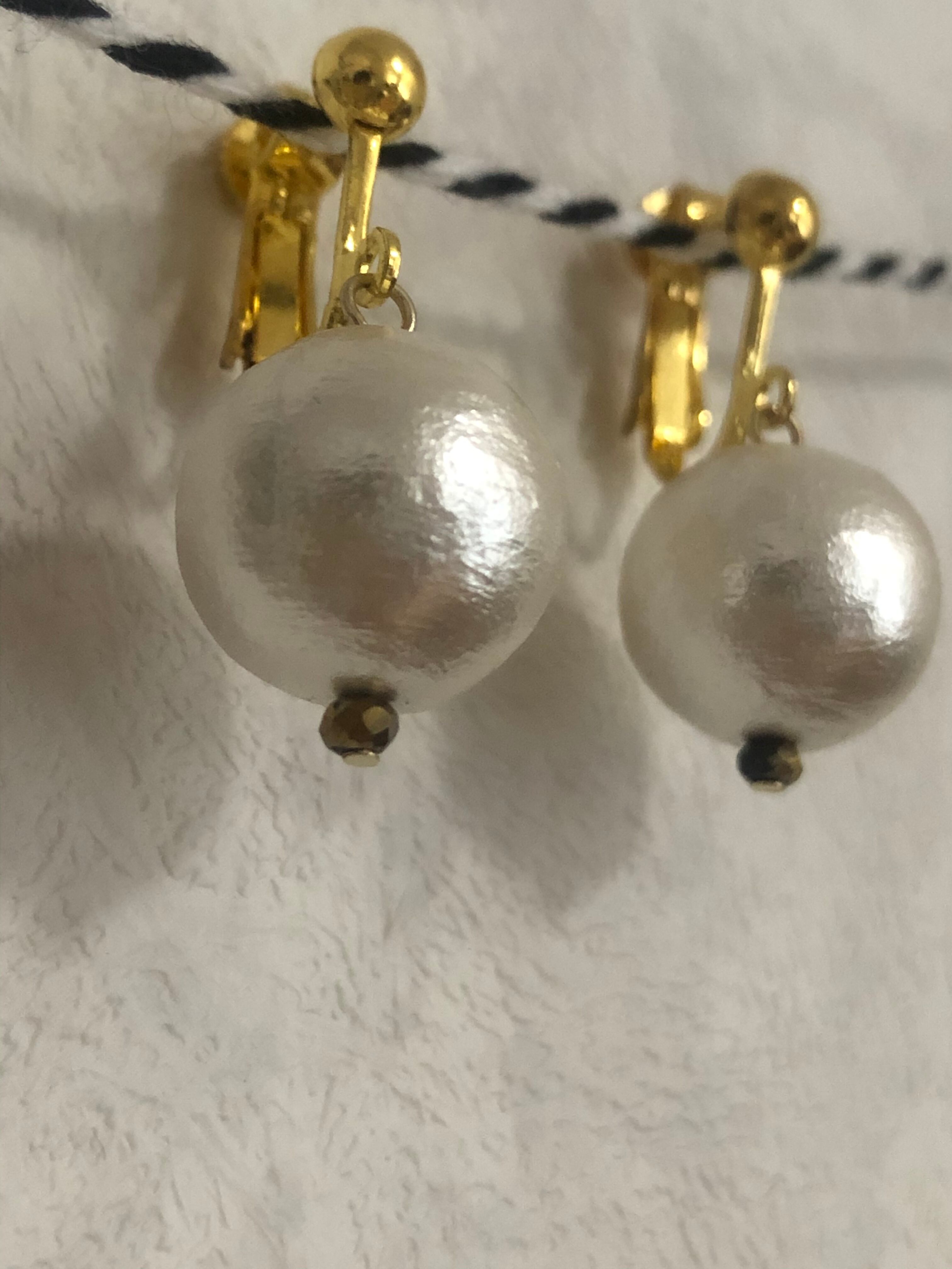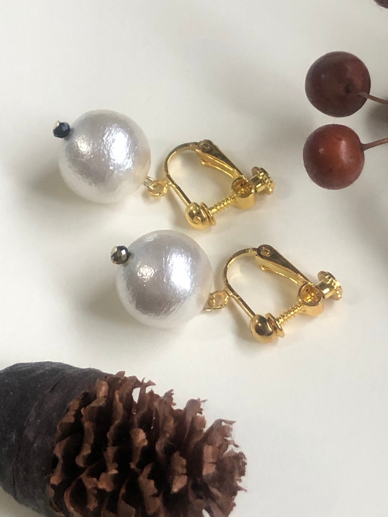 14mmの大粒ホワイトコットンパールを贅沢に使ったイヤリングです。組み合わせているのはゴールドと黒が混ざったカラーのビーズです。